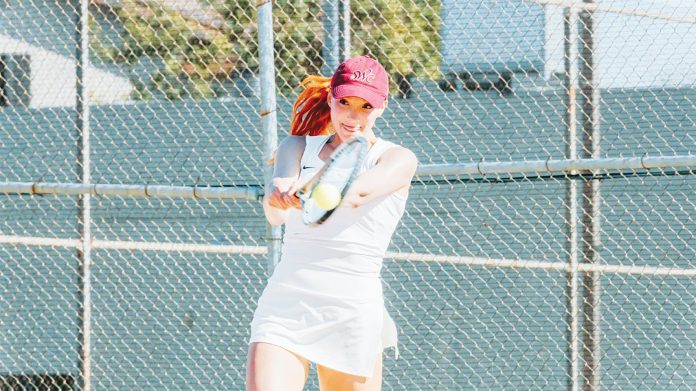 CALM, THEN FURY—Low-keyed Paulina Hernandez unleashes a high-velocity backhand for a point against Grossmont.
